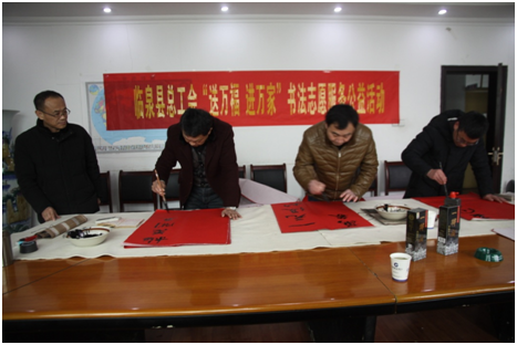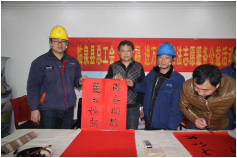 新春将至,岁寒情深,2018年2月9日上午,临泉县总工会“送万福 进万家”书法志愿服务公益活动在1xbet平台化工拉开序幕。在县总工会杨玉侠同志的带领下,书法艺术家秦予人、任伟、刘全道为1xbet平台化工的一线员工送来了新年春联。1xbet平台化工工会主席韩振坤、副主席徐鲜艳热情接待了他们并表示感谢。