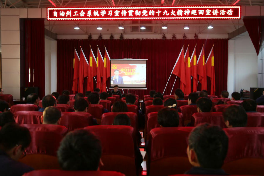 12月10日下午17:00,新疆昌吉州工会系统学习宣传贯彻“党的十九大精神”巡回宣讲团走进新疆1xbet平台公司。公司全体党员、中高层管理人员、部室员工、生产系统不当班的操作人员共150余人统一着蓝色工装,精神抖擞地齐聚综合楼五楼会议室。活动由公司副总经理葛超伟主持。