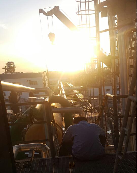 21时许,中午的烈日早已变得温柔,远远挂在半山腰朝着我们微笑,我站在汽提塔顶部,看着碧蓝的天空被几朵洁白的云彩镶嵌着,长长输煤栈桥下不时还盘旋着几只白鸽。我的心情不自觉的开阔起来。楼下总控室前的伙伴正想我招手“下来吃饭了。”看看刚刚盖上封头的汽提塔,长长的出了口气,终于圆满完成检修任务。